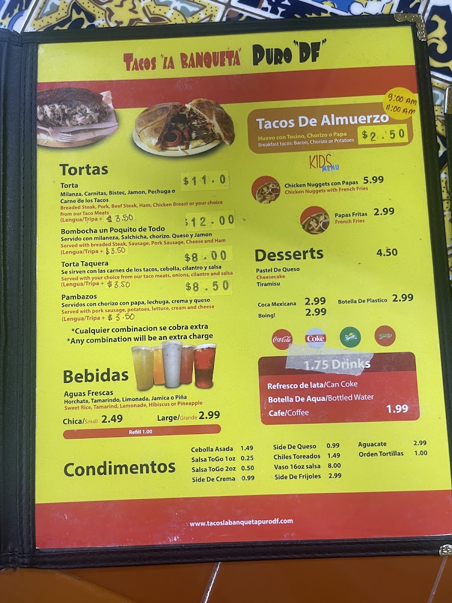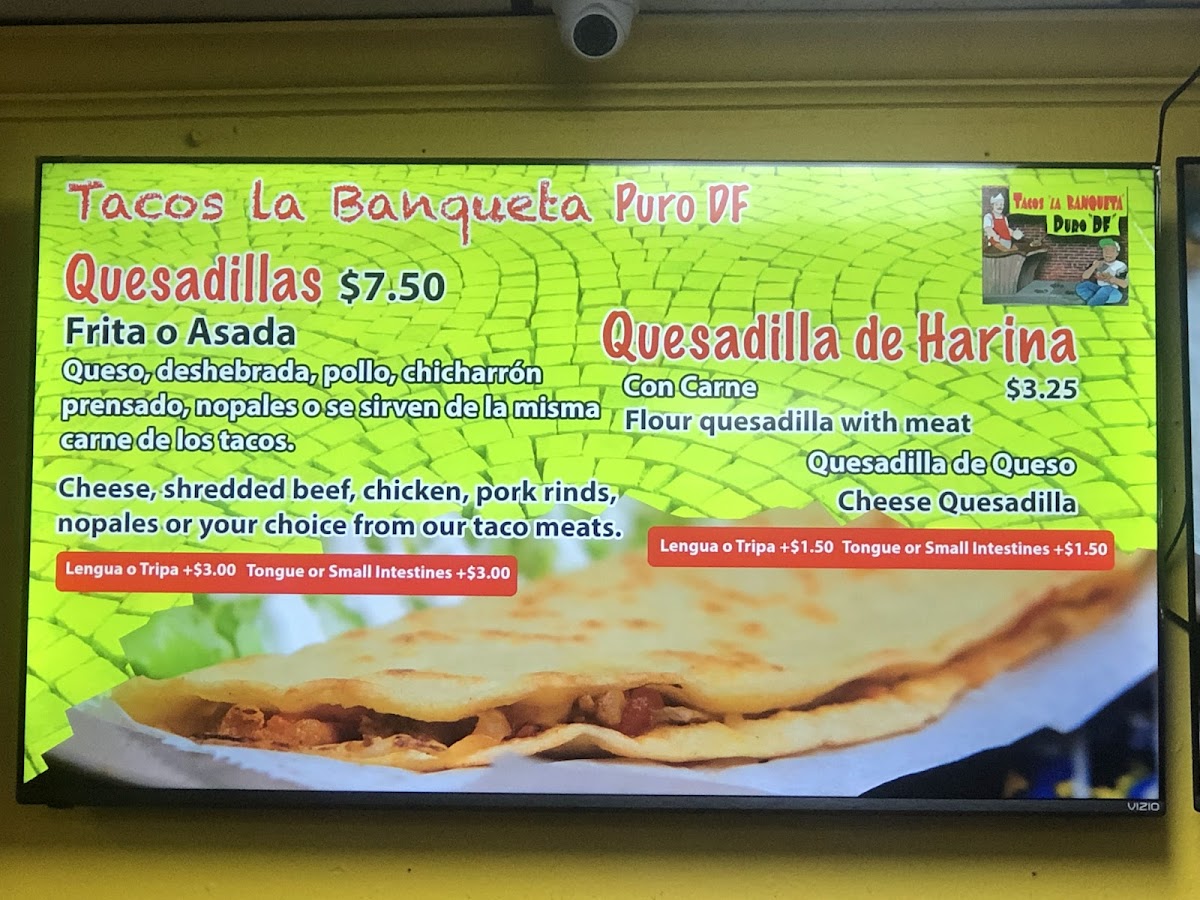Welcome to Tacos La Banqueta Puro DF, a culinary gem nestled in Arlington, TX, where authentic Mexican flavors take center stage. Their menu features mouthwatering options ranging from flavorful Tacos de Lengua and Tacos de Tripa at just $1.75 each, to satisfying Quesadillas bursting with cheese and meat for only $6.00. Each taco is a bite of tradition, perfectly complemented by their signature green salsa, a crowd favorite!